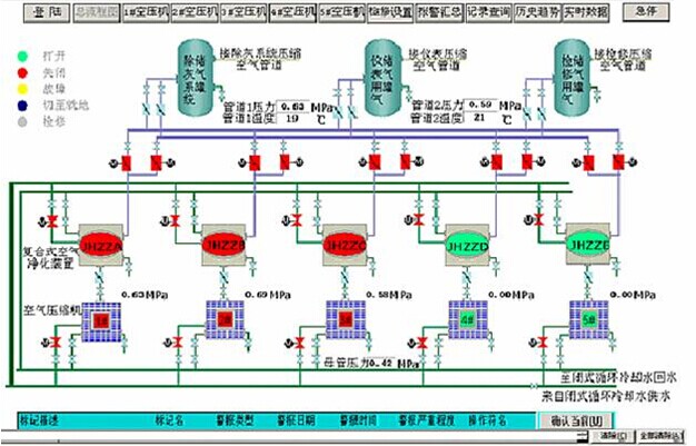 該系統(tǒng)可實(shí)時(shí)監(jiān)測各設(shè)備的運(yùn)行狀態(tài)和運(yùn)行參數(shù),其中包括空壓機(jī)排氣溫度、排氣壓力、空壓機(jī)電流以及母管壓力,通過歷史數(shù)據(jù)分析還可估算設(shè)備運(yùn)行工況的好壞,在任何時(shí)候都能保證空壓站有三臺設(shè)備運(yùn)行,當(dāng)壓力低的時(shí)候自動啟動備用設(shè)備,壓力恢復(fù)自動停止,雙機(jī)熱備冗余配置保證了系統(tǒng)的可靠性。